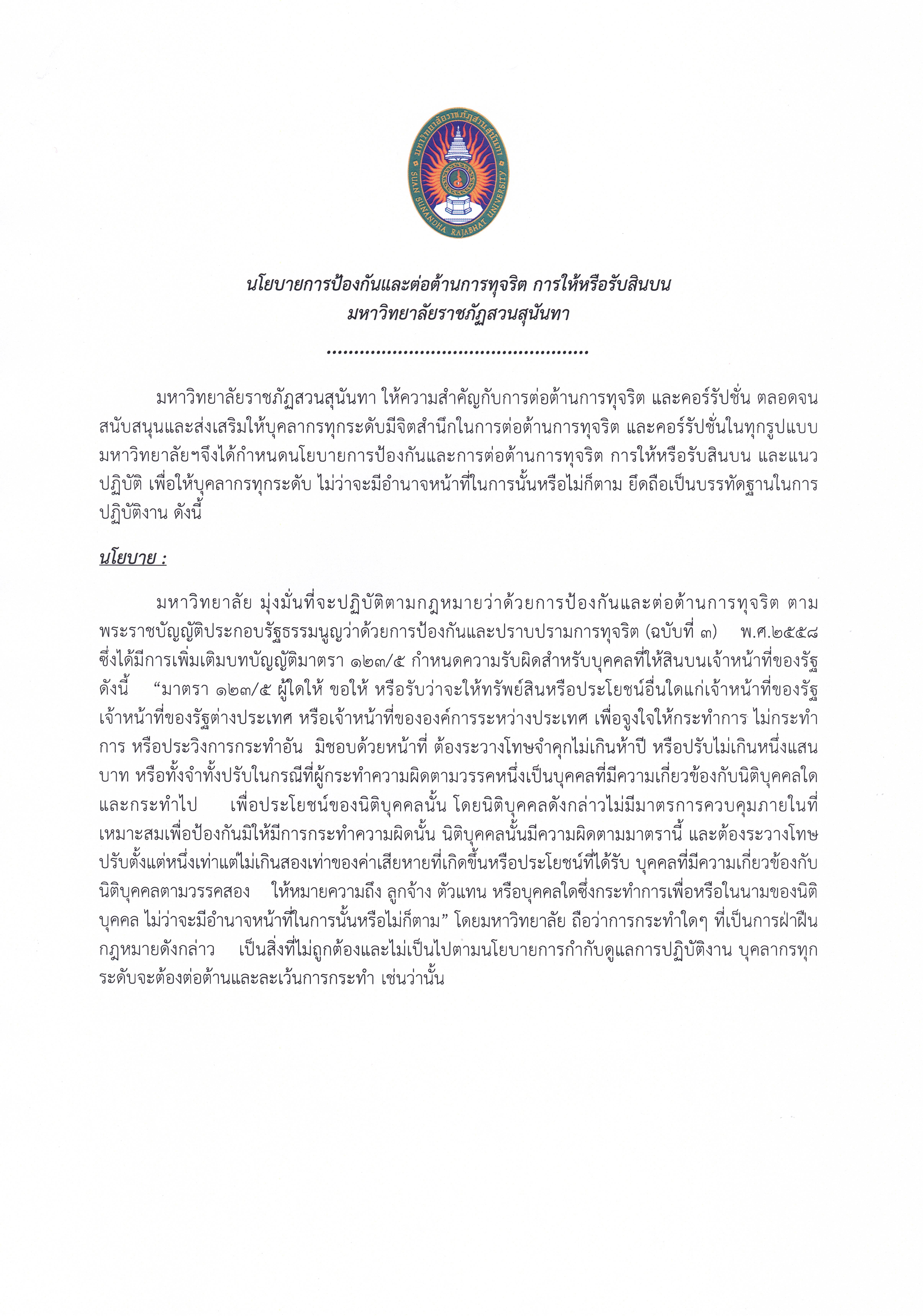 หน้าหลัก > ประกาศ > ทั่วไป > นโยบายการป้องกันและต่อต้านการทุจริต การให้หรือรับสินบน มหาวิทยาลัยราชภัฏสวนสุนันทา