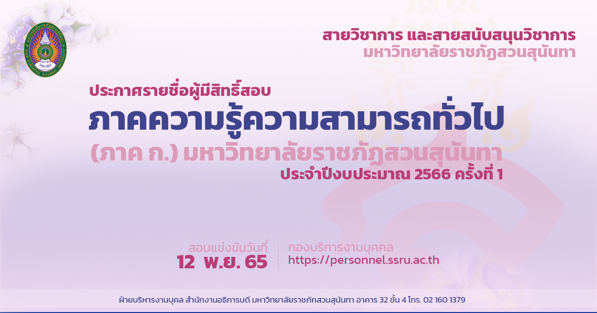 ประกาศรายชื่อผู้มีสิทธิ์สอบภาคความรู้ความสามารถทั่วไป (ภาค ก.) มหาวิทยาลัยราชภัฏสวนสุนันทา ประจำปีงบประมาณ 2566 ครั้งที่ 1.pdf