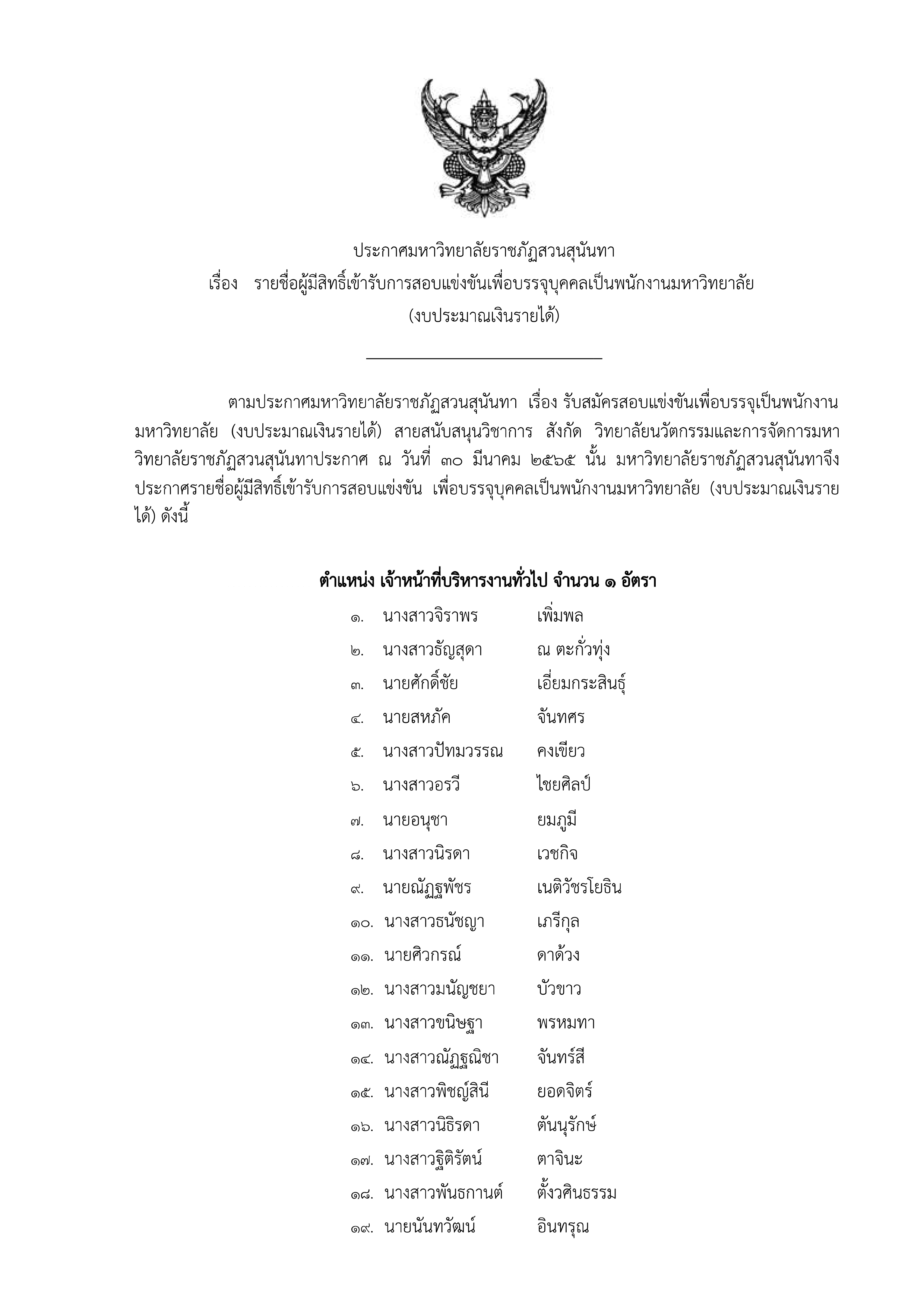 ประกาศรายชื่อผู้มีสิทธิ์สอบแข่งขัน  เจ้าหน้าที่บริหารงานทั่วไป   1   อัตรา  สังกัดวิทยาลัยนวัตกรรมและการจัดการ เพิ่มเติม.pdf
