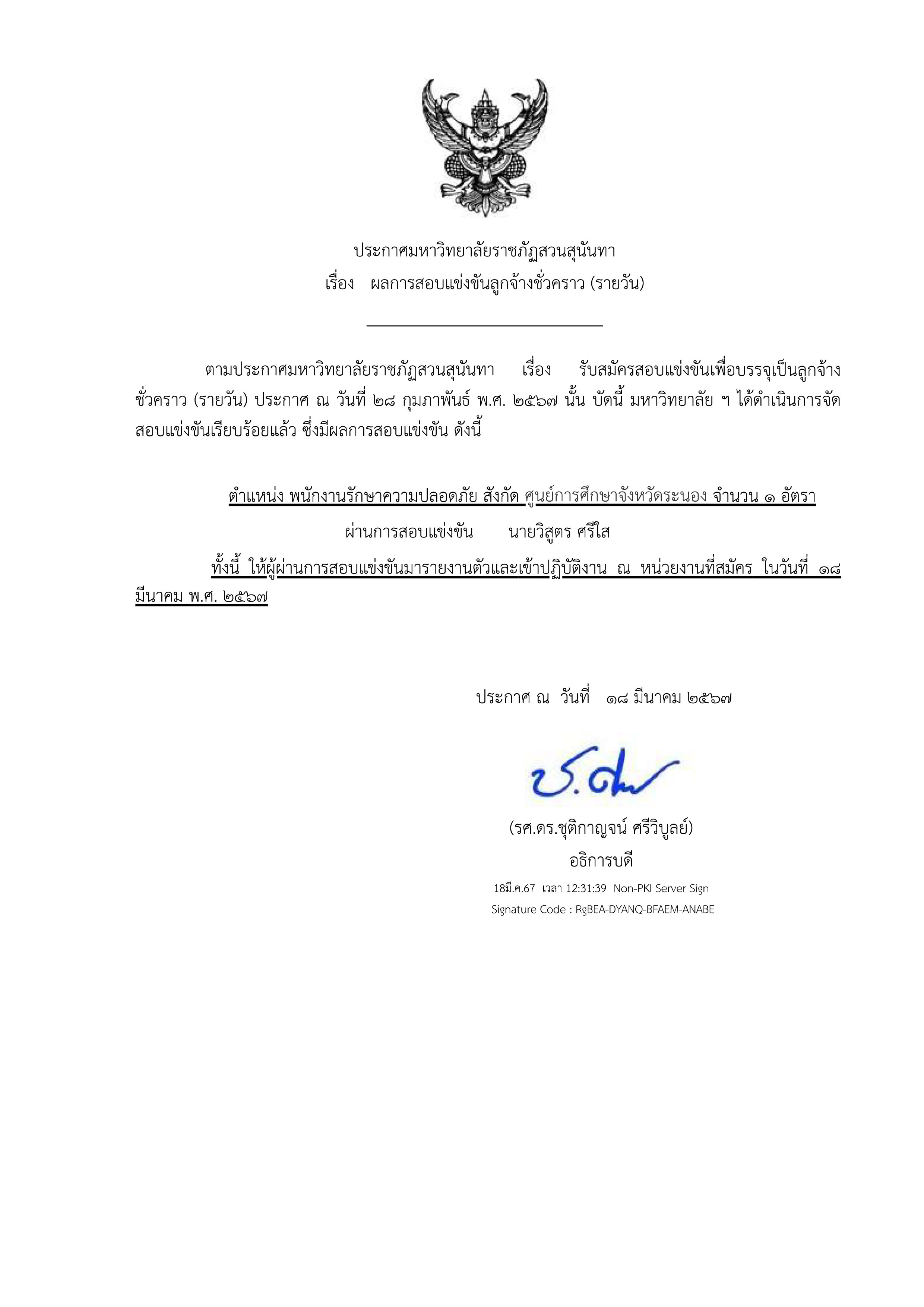 ประกาศผลการรับสมัครลูกจ้างชั่วคราว (รายวัน) ตำแหน่ง พนักงานรักษาความปลอดภัย 1 อัตรา สังกัดศูนย์การศึกษาจังหวัดระนอง.pdf