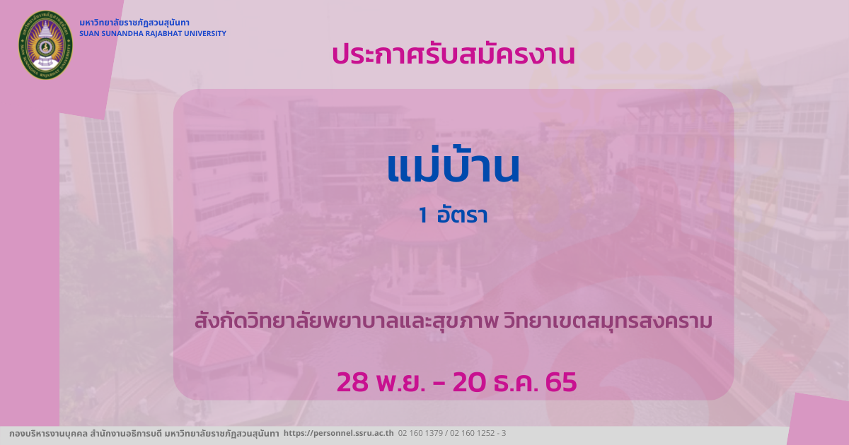 ประกาศรับสมัคร แม่บ้าน 1 อัตรา ตั้งแต่วันที่ 28 พ.ย. - 20 ธ.ค.65 สังกัดวิทยาลัยพยาบาลและสุขภาพ วิทยาเขตสมุทรสงคราม.pdf