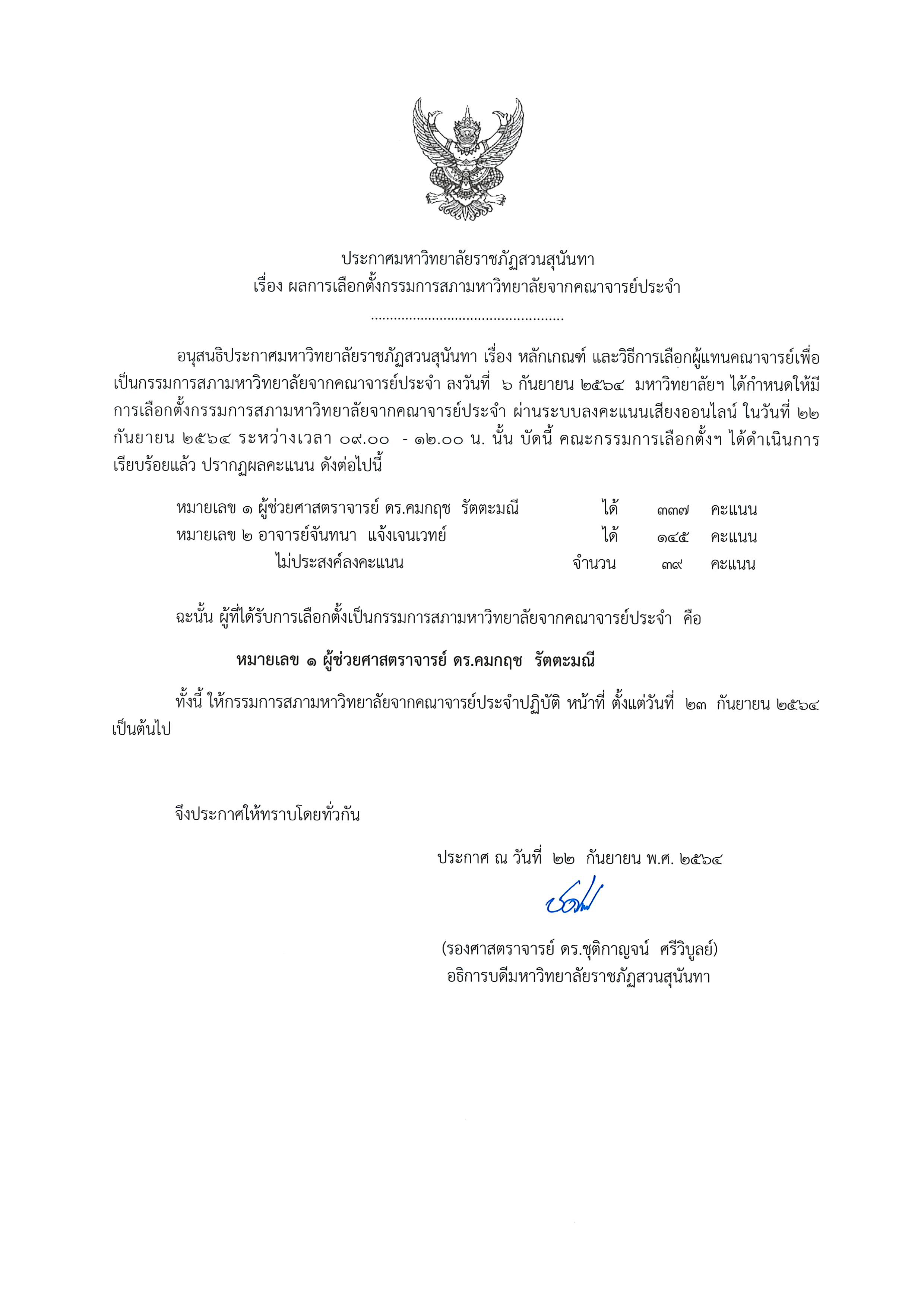 ประกาศฯ ผลการเลือกตั้งกรรมการสภามหาวิทยาลัยจากคณาจารย์ประจำ