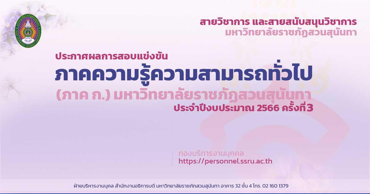 ประกาศผลการสอบแข่งขัน ภาคความรู้ความสามารถทั่วไป (ภาค ก.) มหาวิทยาลัยราชภัฏสวนสุนันทา ประจำปีงบประมาณ 2566 ครั้งที่ 3.pdf