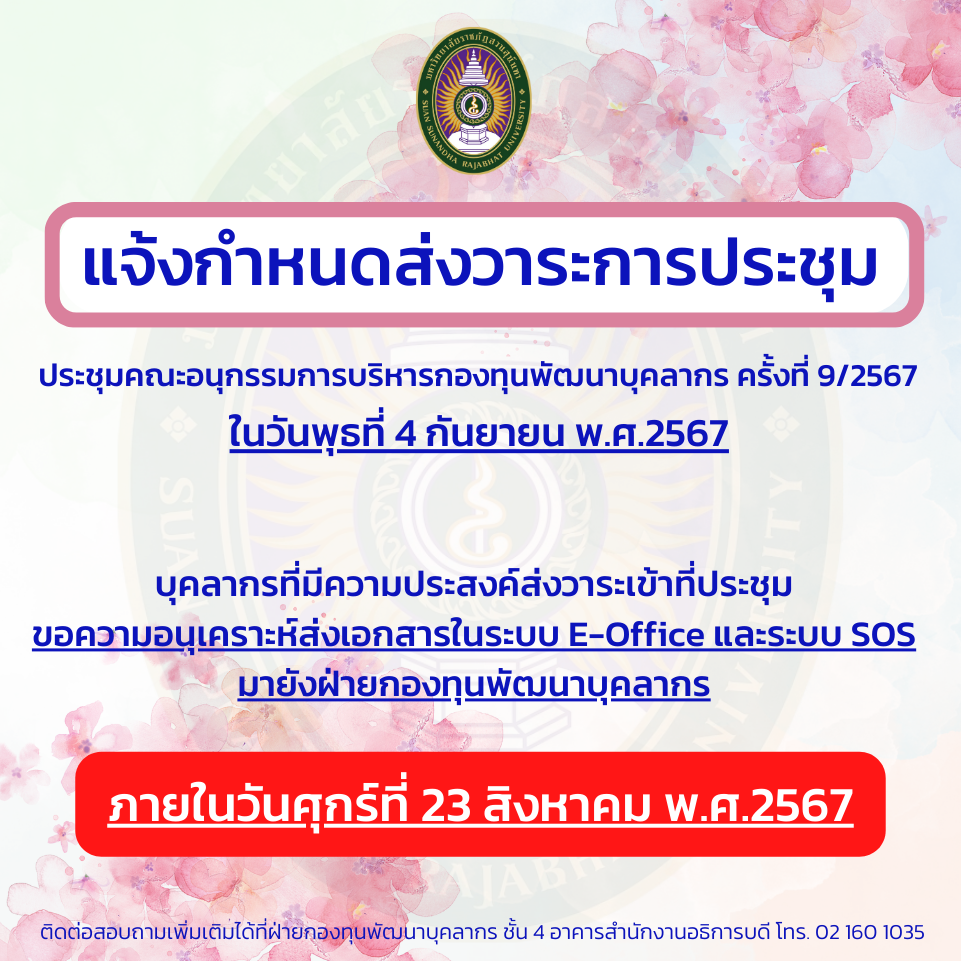 แจ้งกำหนดส่งวาระการประชุม คณะอนุกรรมการบริหารกองทุนพัฒนาบุคลากร ครั้งที่ 9/2567 ภายในวันศุกร์ที่ 23 สิงหาคม พ.ศ.2567