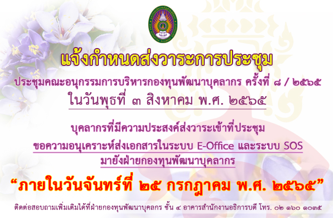 > แจ้งกำหนดส่งวาระการประชุม คณะอนุกรรมการบริหารกองทุนพัฒนาบุคลากร ครั้งที่ ๘/๒๕๖๕ ภายในวันจันทร์ที่ ๒๕ กรกฎาคม พ.ศ.๒๕๖๕