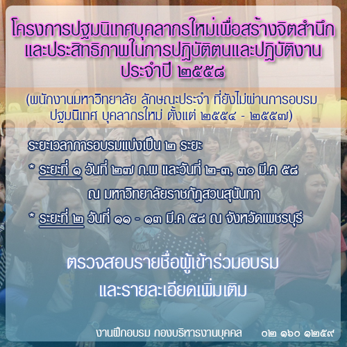 โครงการปฐมนิเทศบุคลากรใหม่เพื่อสร้างจิตสำนึกและประสิทธิภาพในการปฏิบัติตนและปฏิบัติงานประจำปี ๒๕๕๘