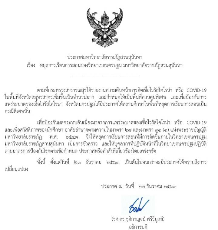 ประกาศมหาวิทยาลัยราชภัฎสวนสุนันทา เรื่อง หยุดการเรียนการสอนของวิทยาเขตนครปฐม เป็นการชั่วคราว.pdf