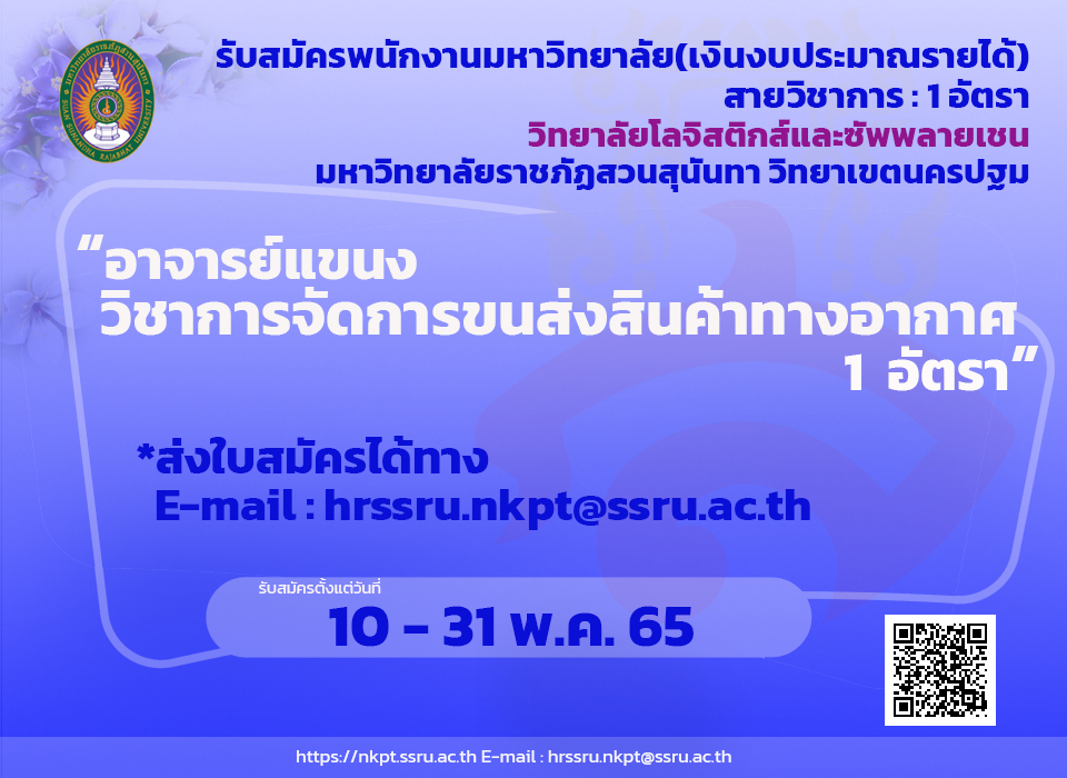 ประกาศรับสมัคร อาจารย์แขนงวิชาการจัดการขนส่งสินค้าทางอากาศ 1 อัตรา ตั้งแต่วันที่ 10 - 31 พ.ค.65 สังกัดวิทยาลัยโลจิสติกส์และซัพพลายเชน วิทยาเขตนครปฐม.pdf