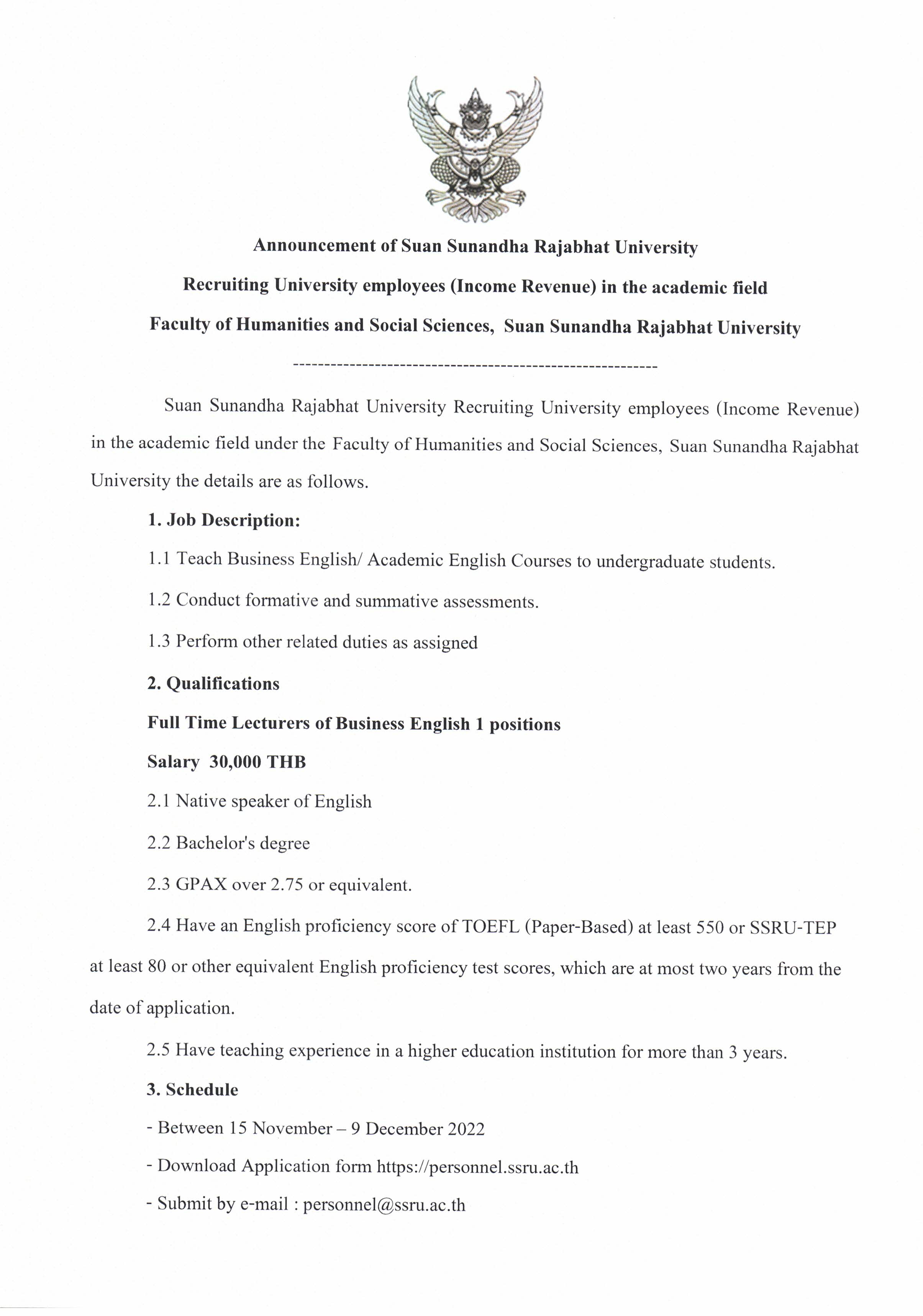 1 positions, Between 15 Nov. - 9 Dec.