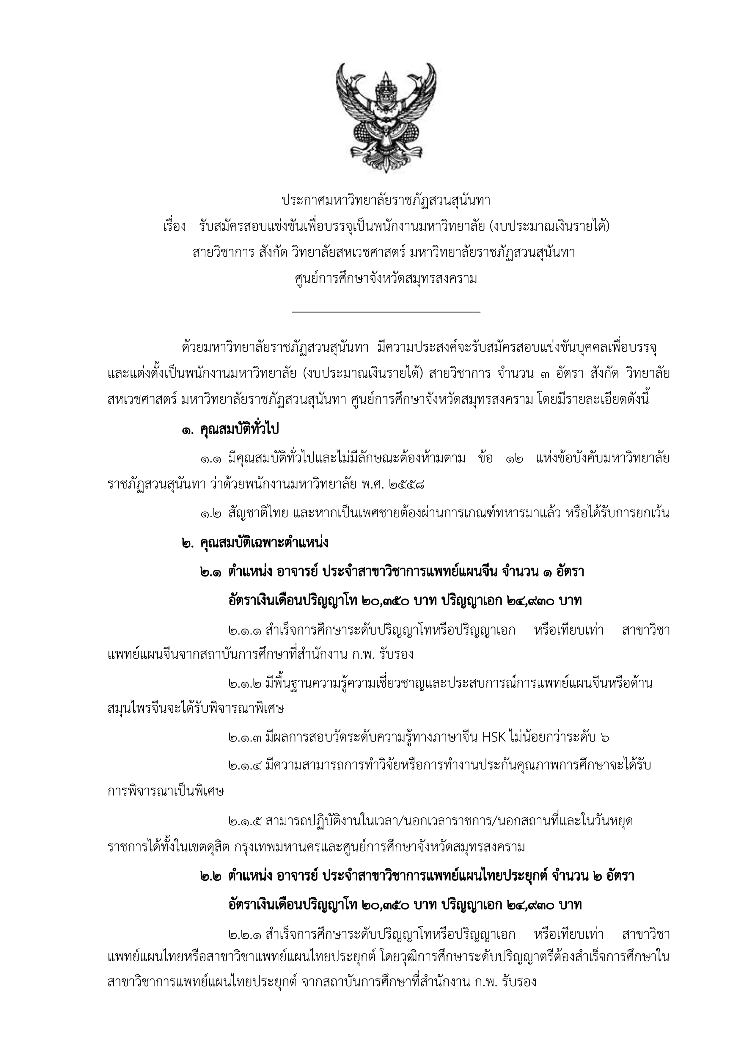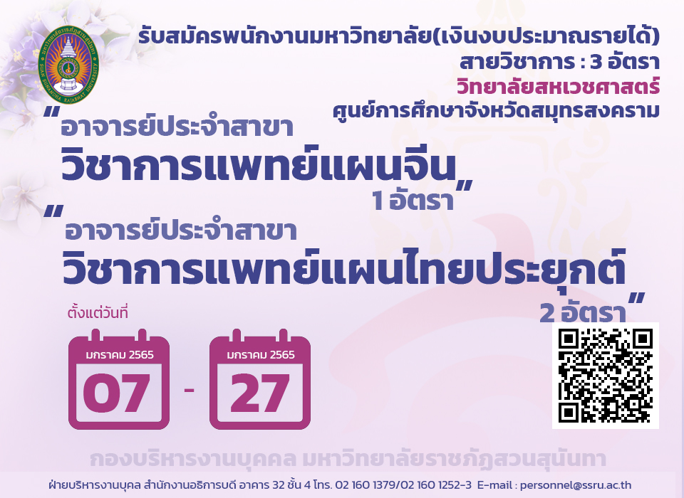 ประกาศรับสมัคร อาจารย์ประจำสาขาวิชาการแพทย์แผนจีน 1 อัตรา/ อาจารย์ประจำสาขาวิชาการแพทย์แผนไทย 2 อัตรา ตั้งแต่วันที่ 7 - 27 ม.ค.65 สังกัดวิทยาลัยสหเวชศาสตร์.pdf